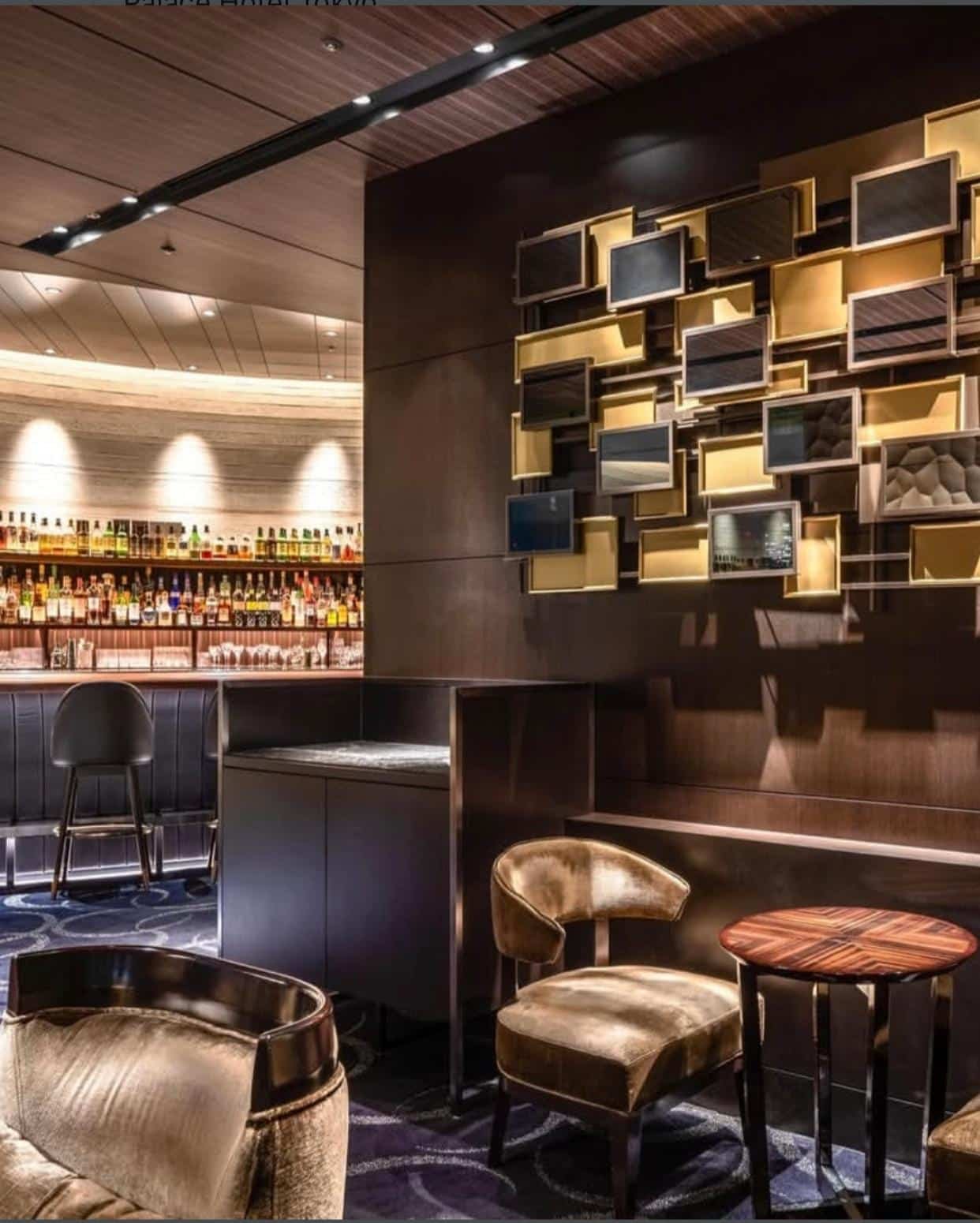 Le bar du Palace Hotel Tokyo est un espace feutré, structuré autour de matières sombres et de lumières basses.