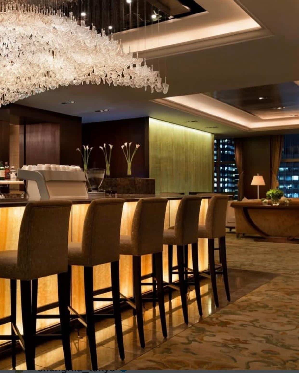 Le bar du Shangri-La Tokyo est un espace feutré où les matières sombres absorbent la lumière.